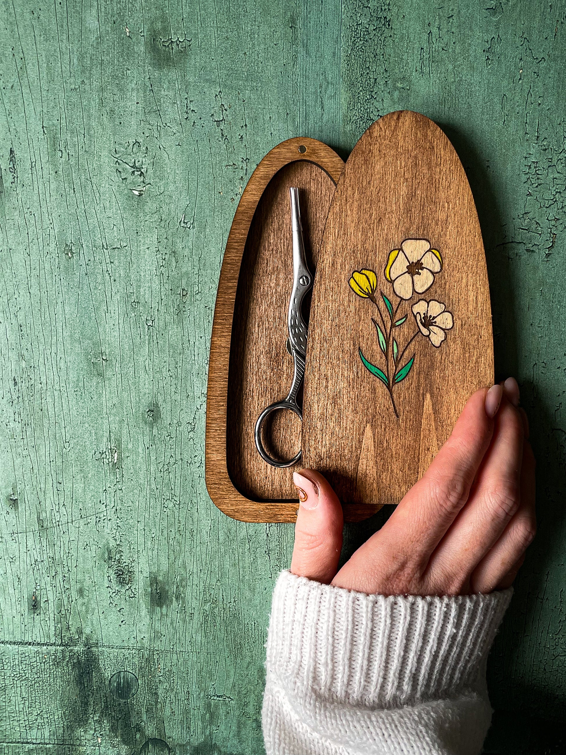Étui en bois gravé pour ciseaux de broderie avec couvercle magnétique